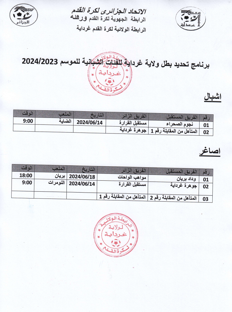 برنامج تحديد بطل ولاية غرداية للفئات الشبانية للموسم 2023/2024