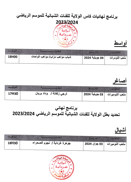 برنامج نهائيات كأس ولاية غرداية للفئات الشبانية لموسم 2024/2023