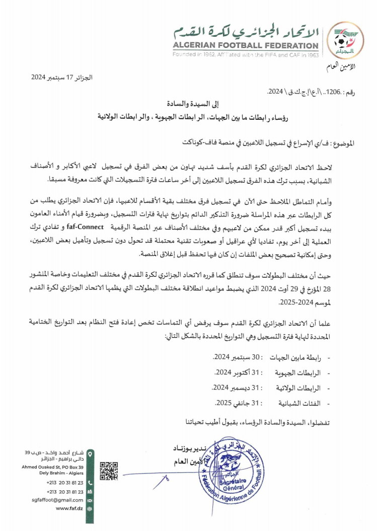 مراسلة بخصوص الإسراع بتسجيل اللاعبين على مستوى منصة فاف-كونيكت