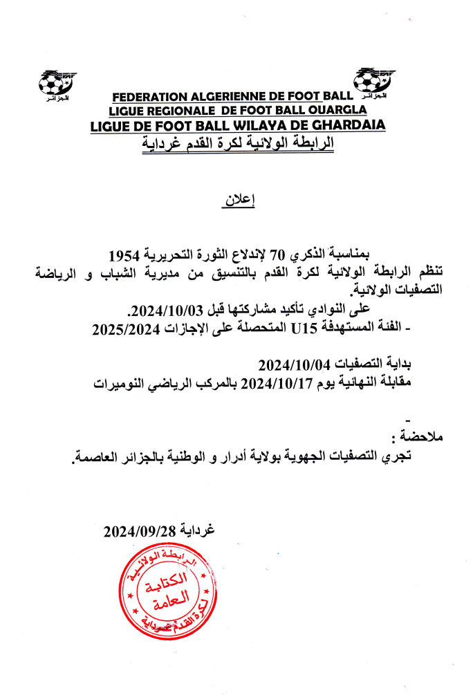 Tous droits réservés © 2014 - 2026 Ligue Wilaya de Football - Ghardaia.