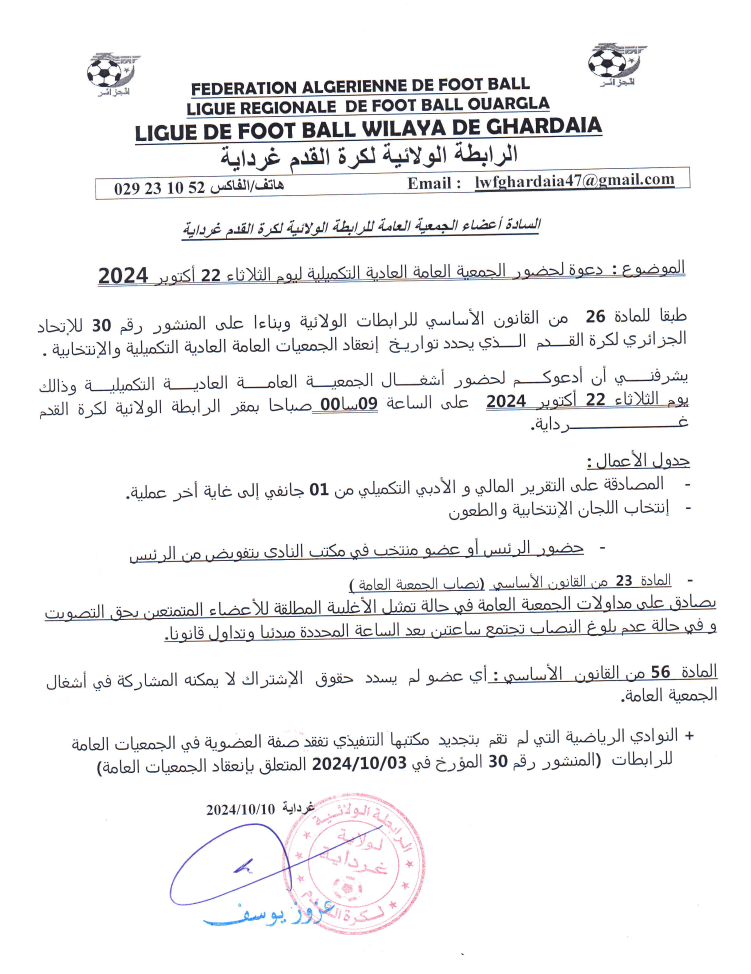 دعوة للجمعية العامة العادية التكميلية ليوم الثلاثاء 22 أكتوبر 2024