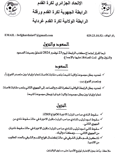Tous droits réservés © 2014 - 2026 Ligue Wilaya de Football - Ghardaia.
