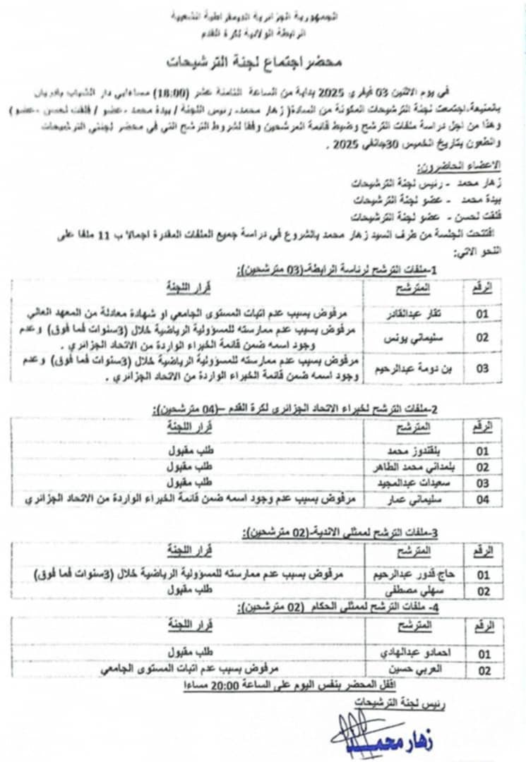محضر لجنة الترشيحات لإنتخابات الرابطة الولائية لكرة القدم المنيعة