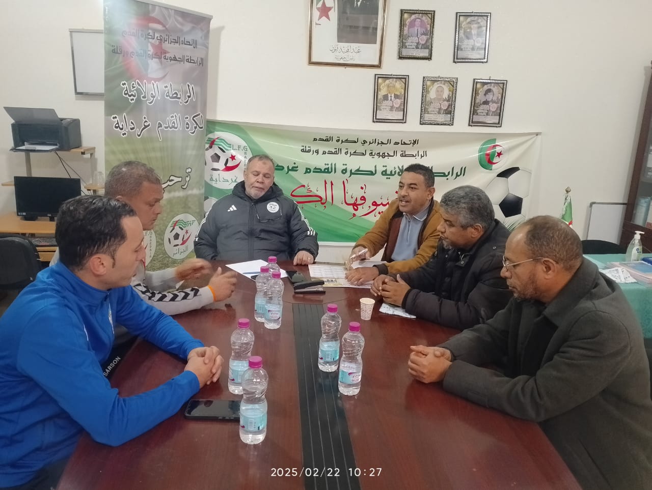 بتاريخ الثاني والعشرون فيفري الفين وخمسة وعشرون بمقر الرابطة على الساعة العاشرة صباحا . انعقد مكتب الرابطة الولائية لكرة القدم غرداية برئاسة السيد رئيس الرابطة يوسف عزوز وبحضور السادة :