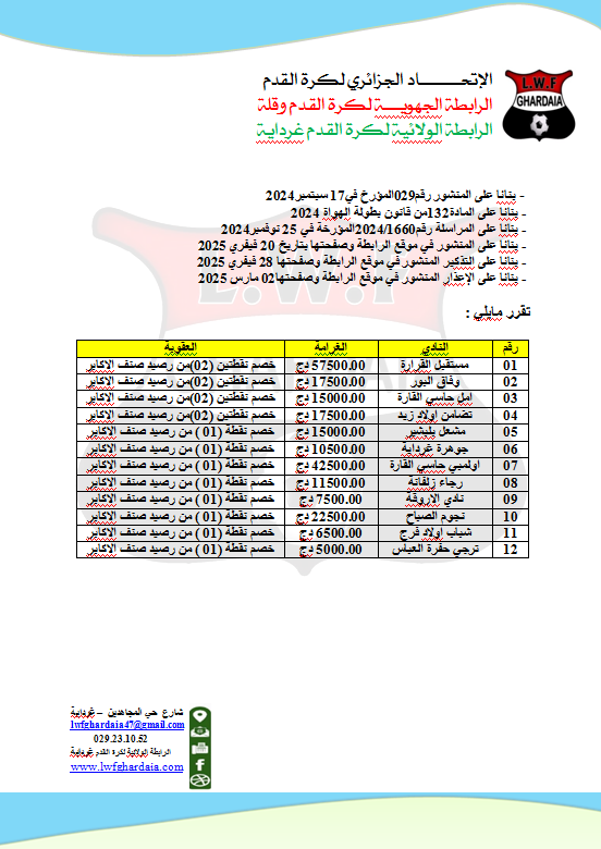 Tous droits réservés © 2014 - 2026 Ligue Wilaya de Football - Ghardaia.