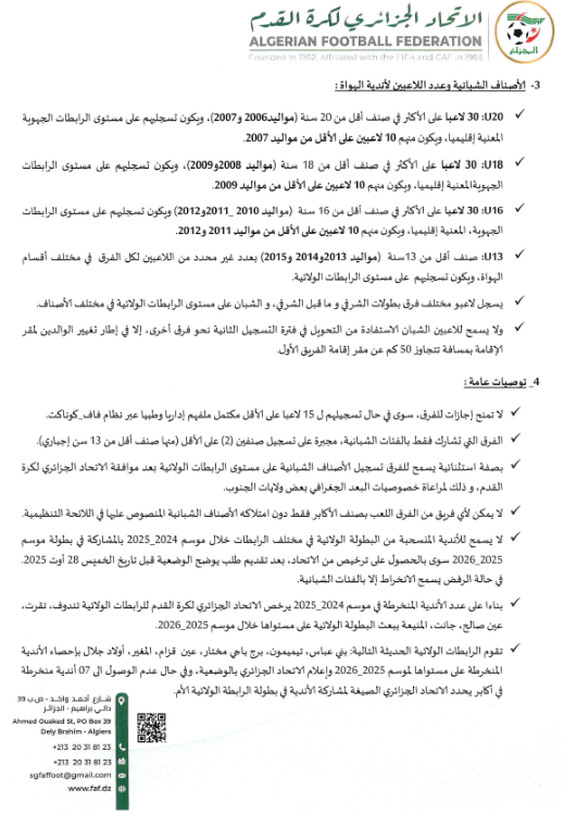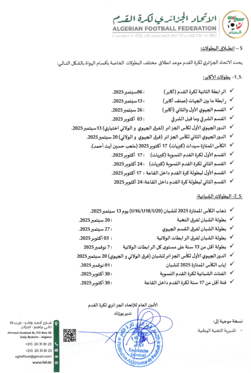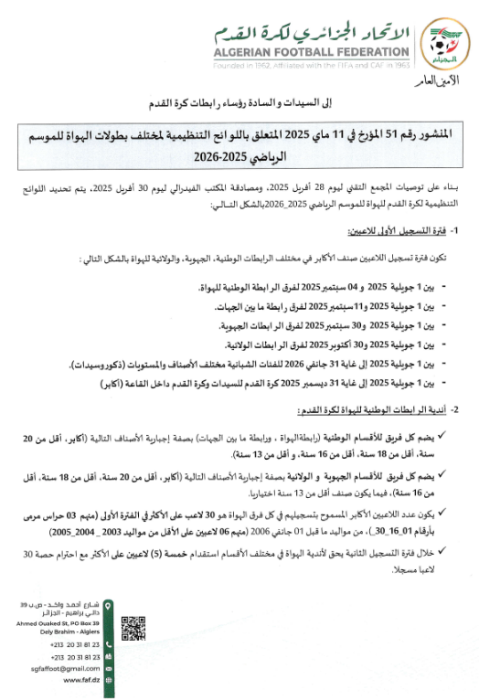 المنشور رقم 51 المؤرخ في 11 ماي 2025 المتعلق باللوائح التنظيمية لمختلف بطولات الهواة للموسم الرياضي 2026/2025 .