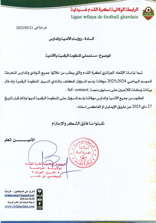 2014 - 2026 Ligue Wilaya de Football - Ghardaia.