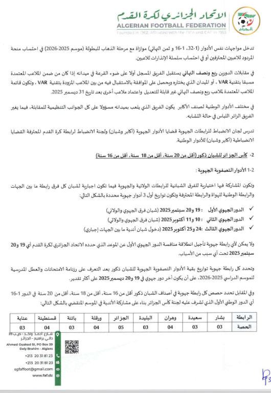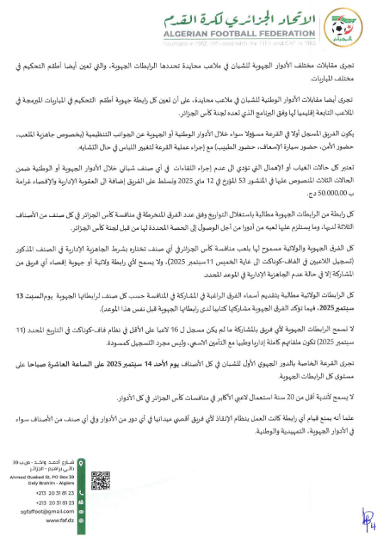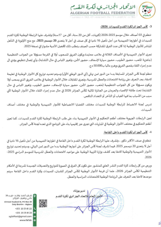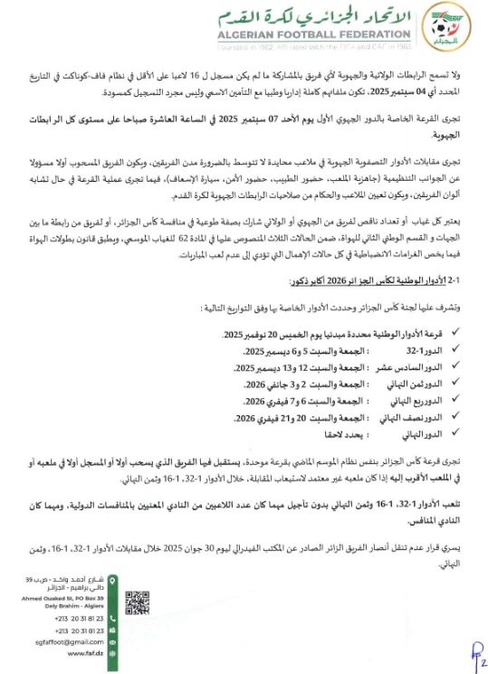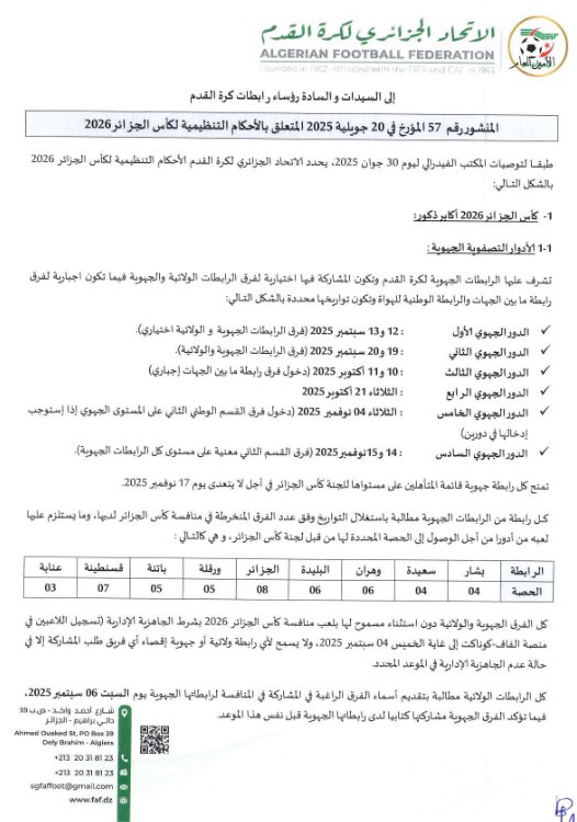 المنشور 57 الخاص بالأحكام التنظيمية لكآس الجزائر 2026