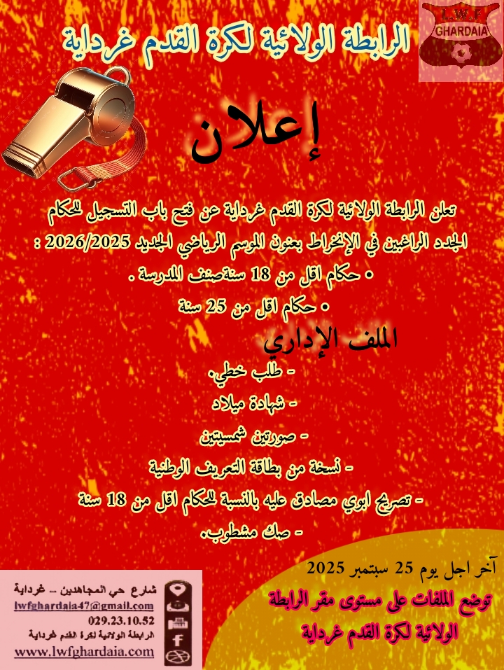Tous droits réservés © 2014 - 2026 Ligue Wilaya de Football - Ghardaia.