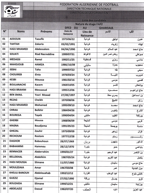 تدعو الرابطة الولائية لكرة القدم غرداية جميع المتربصين في القائمة آدناه أنه تم تحديد تربص المدربين FAF2 (S1) بتاريخ 27 ديسمبر 2025 إلى غاية 31 ديسمبر 2025 بقاعة الأمير عبد القادر وسط مدينة غرداية على الساعة 9:00 صباحا .