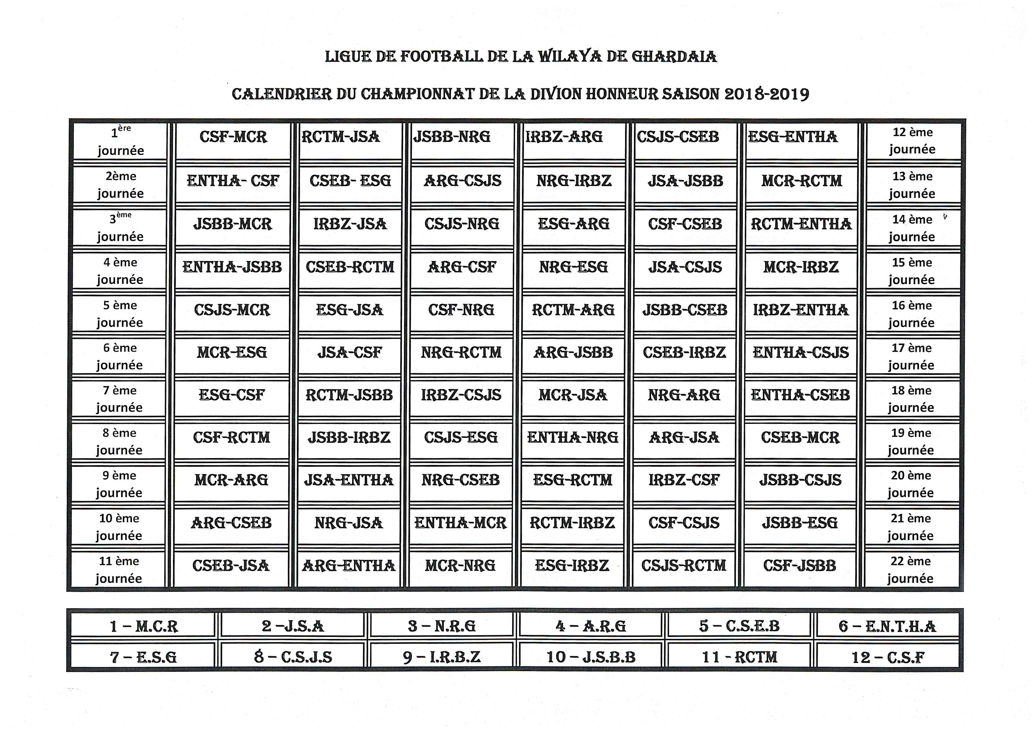 CALENDRIER DU CHAMPIONNAT DE LA DIVISION HONNEUR SAISON 2018-2019