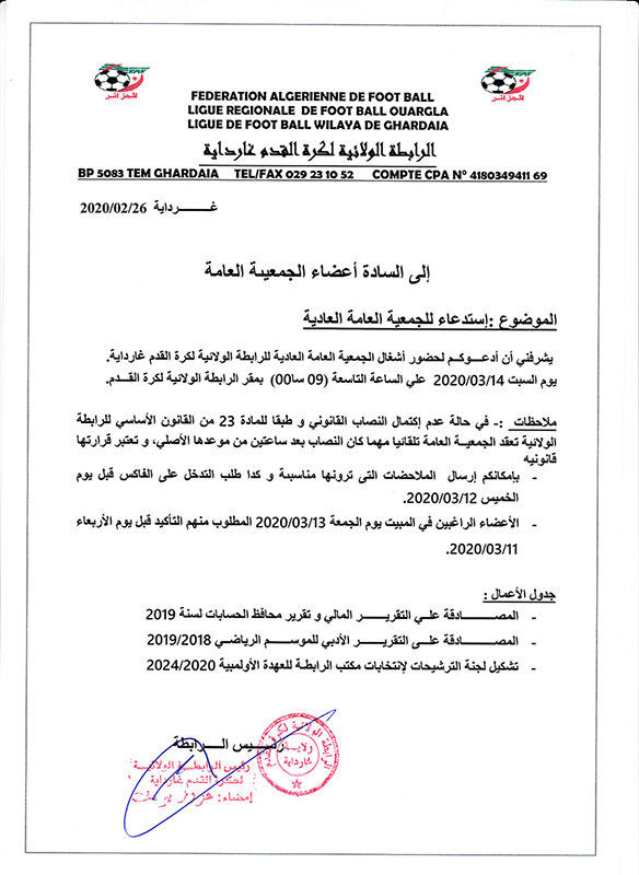 Tous droits réservés © 2014 - 2026 Ligue Wilaya de Football - Ghardaia.