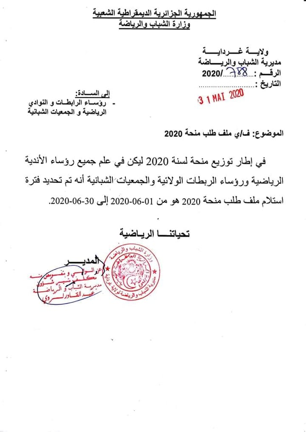 مراسلة مديرية الشباب و الرياضة بخصوص ملف طلب منحة 2020