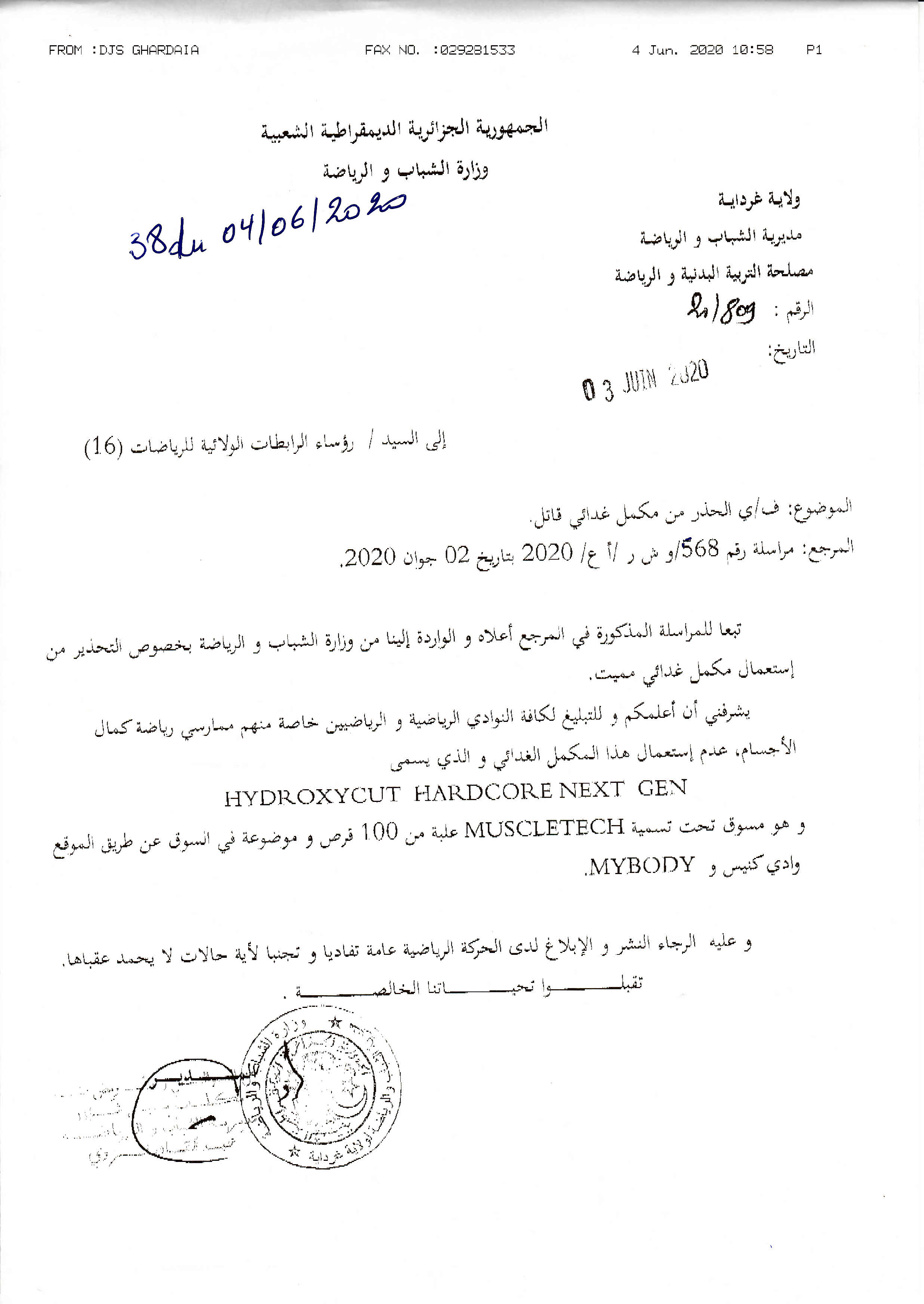 مراسلة مديرية الشباب و الرياضة بخصوص استعمال مكمل غذائي قاتل