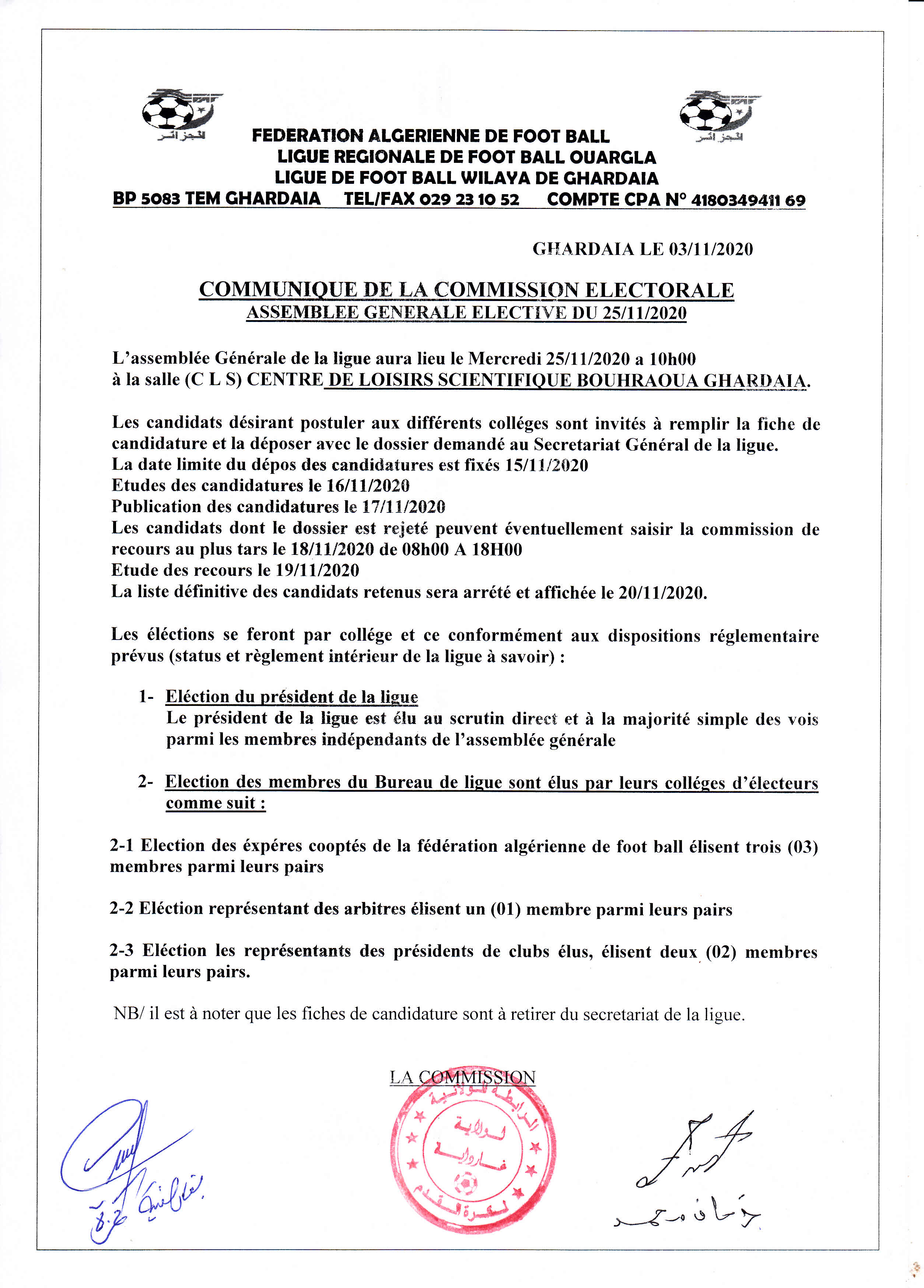 Communique de la commission electorale ASSEMBLEE GENERALE ELECTIVE DU 25/11/2020