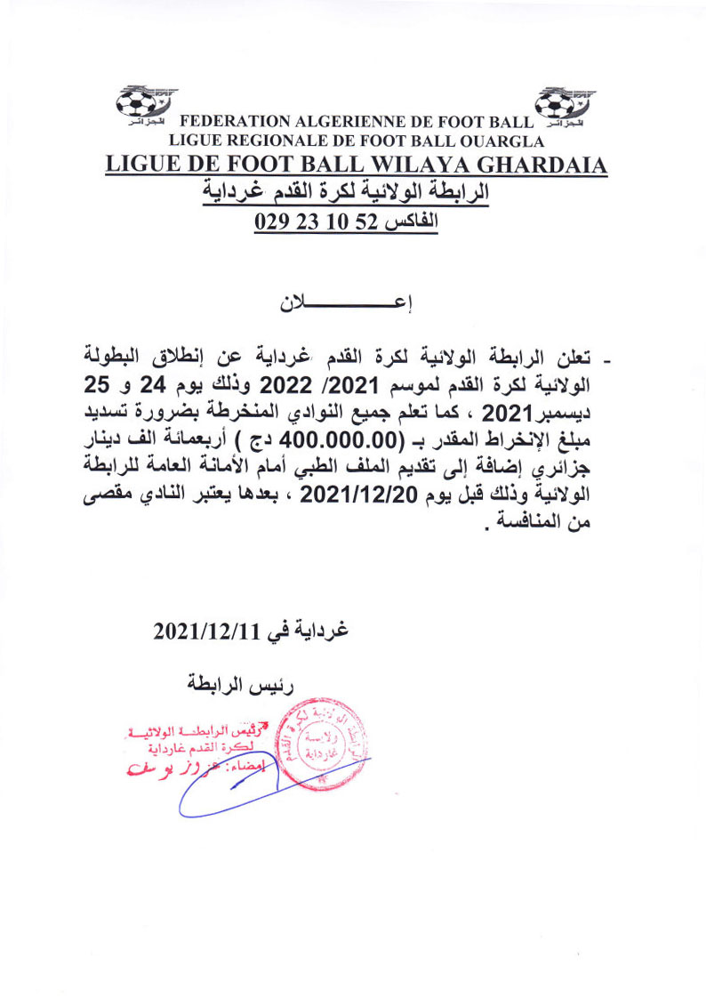 Tous droits réservés © 2014 - 2026 Ligue Wilaya de Football - Ghardaia.