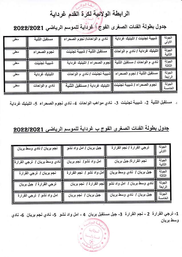 جدول بطولة الفئات الصغرى فوج غرداية أ/ب للموسم الرياضي 2021/2022