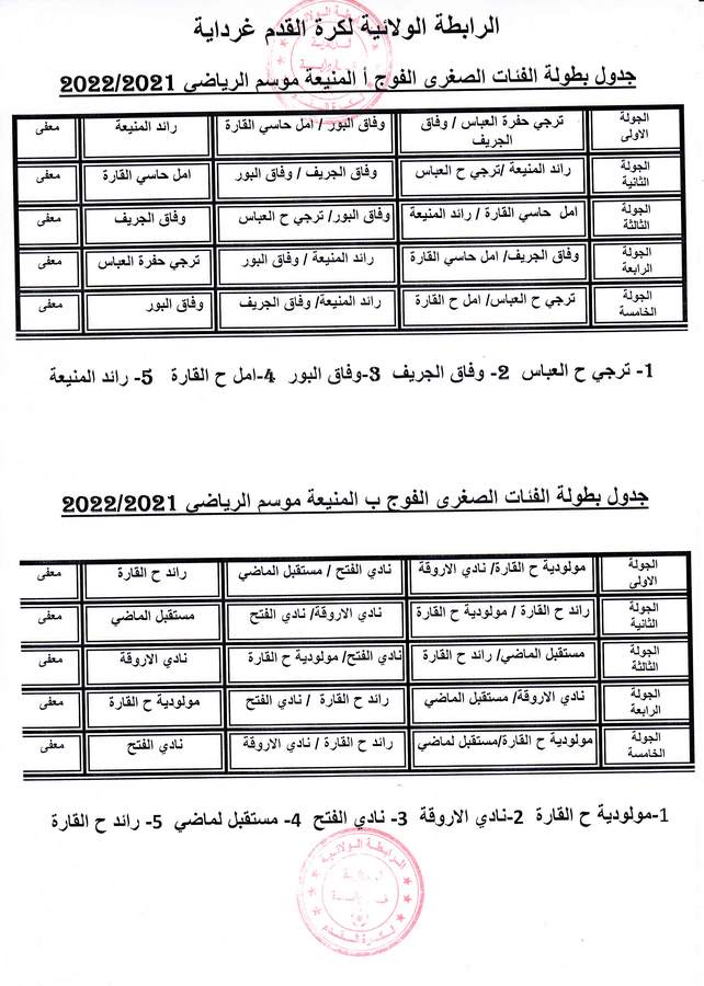 جدول بطولة الفئات الصغرى فوج المنيعة أ/ب للموسم الرياضي 2021/2022