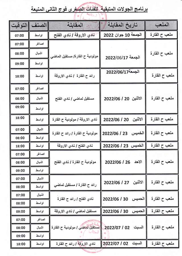 برنامج الجولات المتبقية للفئات لصغرى فوج غرداية و فوج المنيعة الأول و الثاني