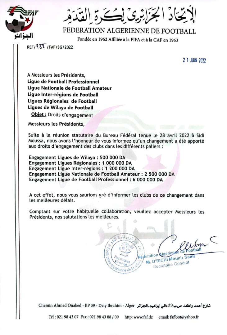 تبعا لمراسلة الإتحاد الجزائري لكرة القدم بتاريخ 21 جوان 2022 فإنه تم تعديل حقوق إنخراط الاندية على مستوى الرابطة الولائية لكرة القدم إلى 500000 دج ( 50 مليون سنتيم) بدايةً من الموسم 2023/2022