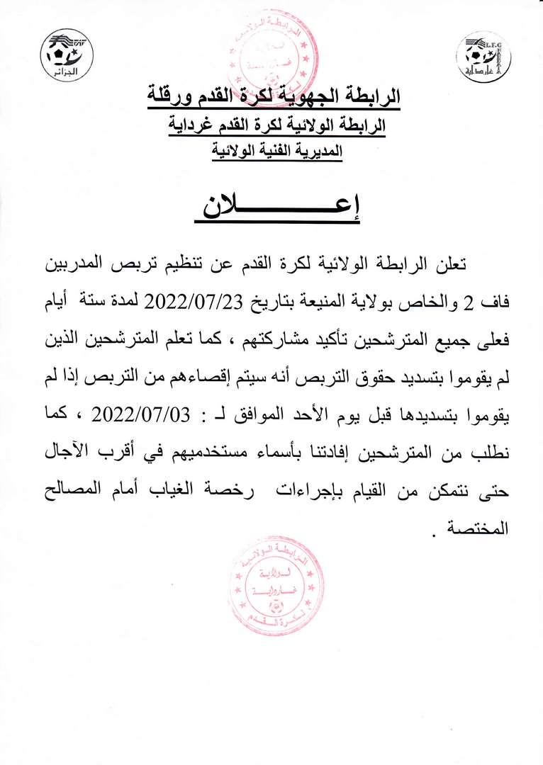 إعلان بخصوص تربص المدربين فاف 2 و الخاص بولاية المنيعة