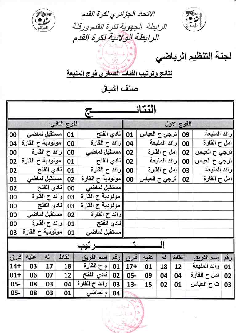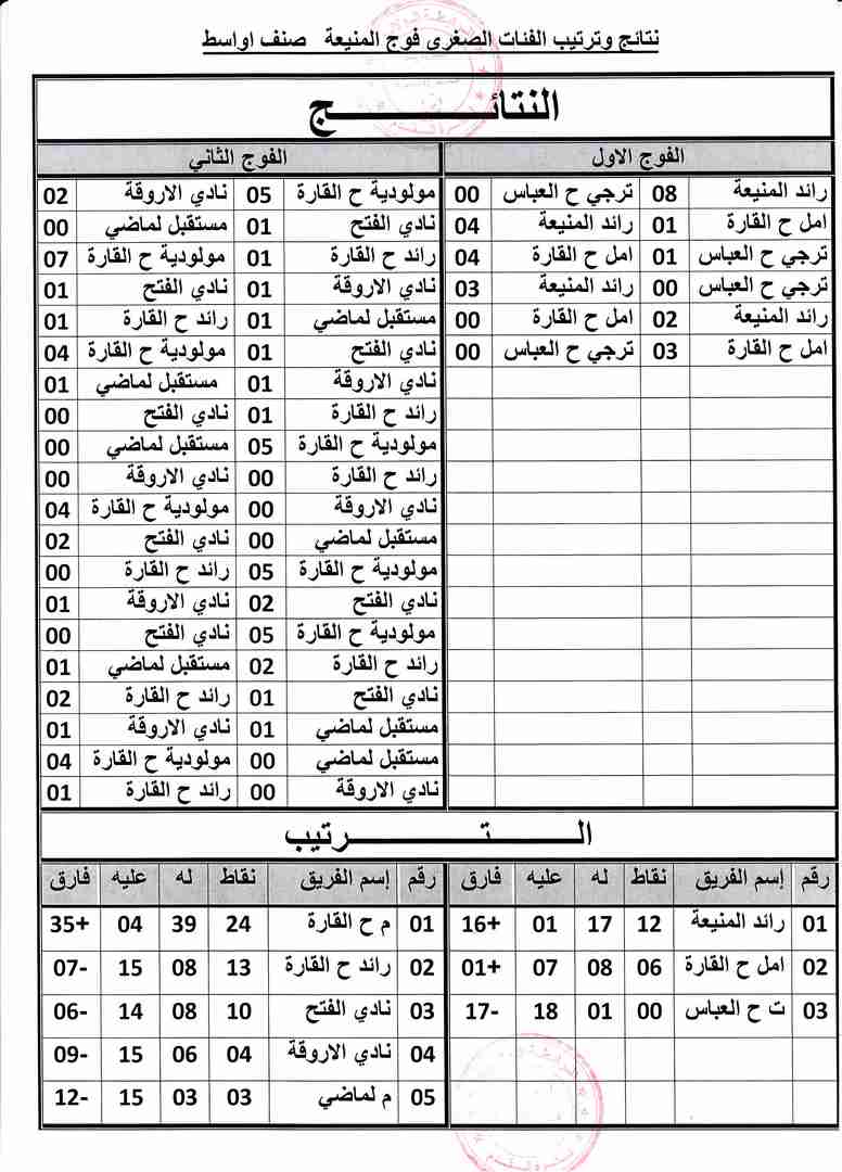 النتائج النهائية لبطولة الفئات الصغرى فوج المنيعة