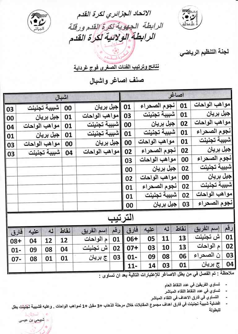 نتائج و ترتيب الفئات الصغرى فوج غرداية صنف أصاغر و أشبال
