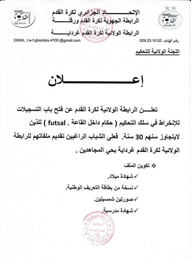 Tous droits réservés © 2014 - 2026 Ligue Wilaya de Football - Ghardaia.