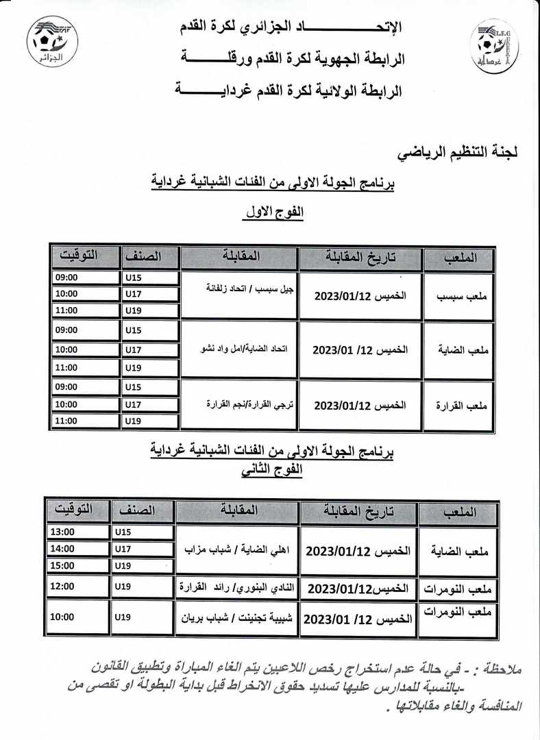 برنامج الجولة الاولى للفئات الشبانية غرداية الفوج الاول و الثاني