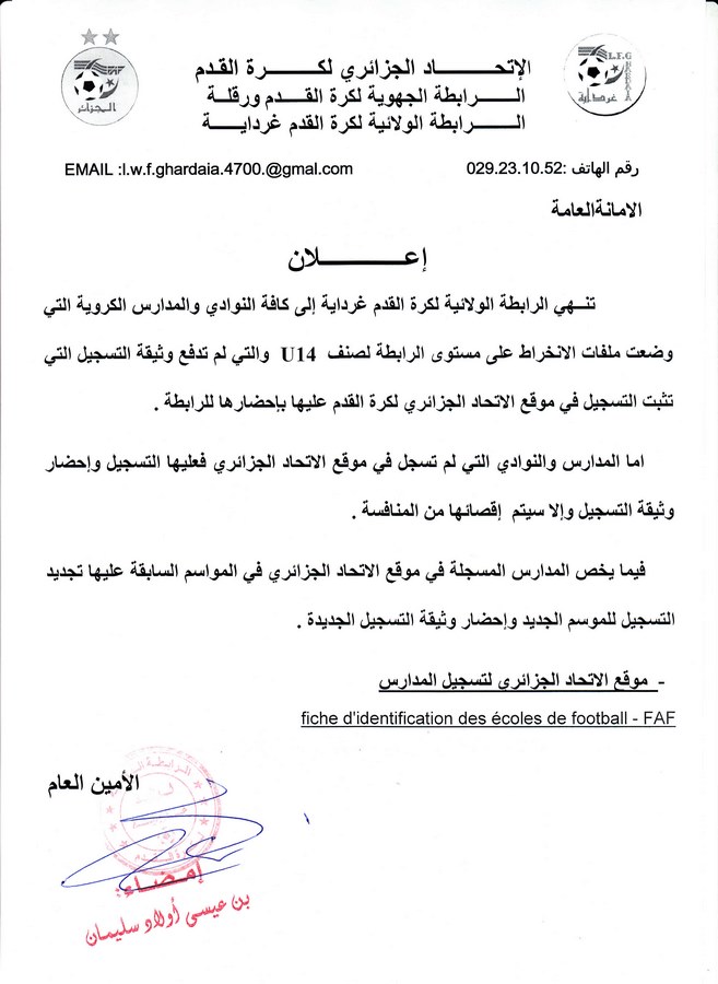 Tous droits réservés © 2014 - 2026 Ligue Wilaya de Football - Ghardaia.