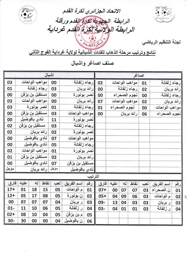 نتائج و ترتيب مرحلة الذهاب للفئات الشبانية لولاية غرداية الفوج الثاني صنف أصاغر و أشبال