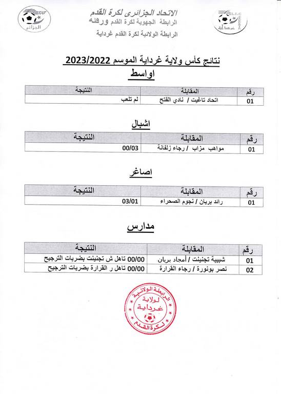 نتائج كأس ولاية غرداية للموسم 2022/2023
