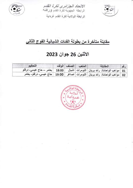 مقابلات متأخرة من بطولة الفئة الشبانية الفوج الثاني
