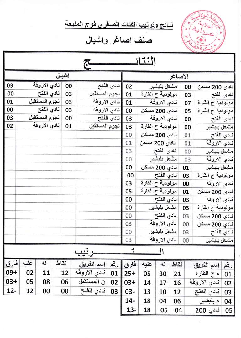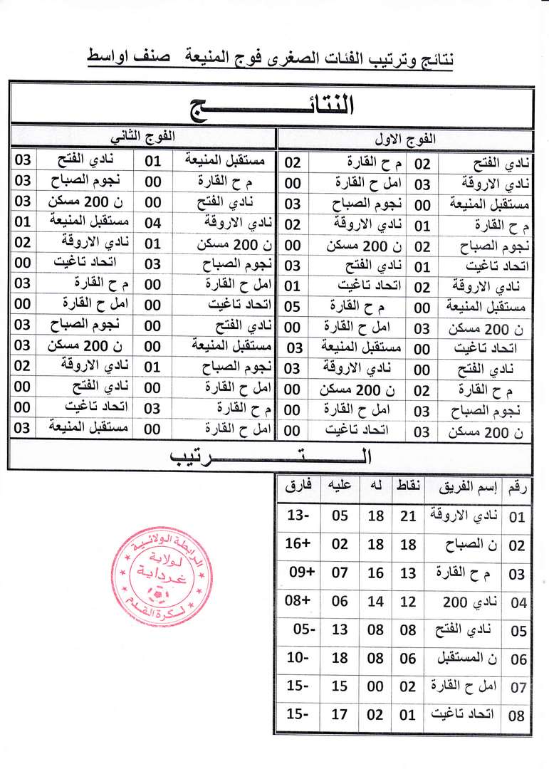 نتائج و ترتيب الفئات الصغرى فوج المنيعة