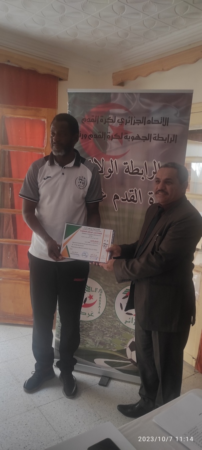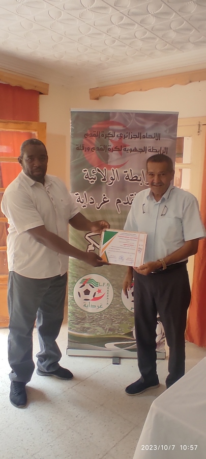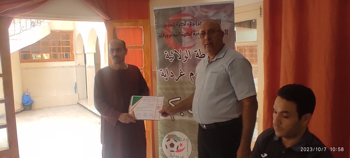 أشرف اليوم السيد عزوز يوسف و اعضاء من المكتب التنفيذي للرابطة الولائية على توزيع شهادات المدربينFAF2/FAF1 بولاية المنيعة بحضور المدير الولائي للشباب و الرياضة السيد زنقط عبد القادر